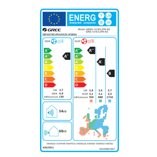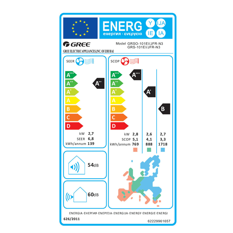 Ετήσια κατανάλωση ρεύματος: 139 kWh (ψύξη) / 1718/888/769 kWh (θέρμανση).